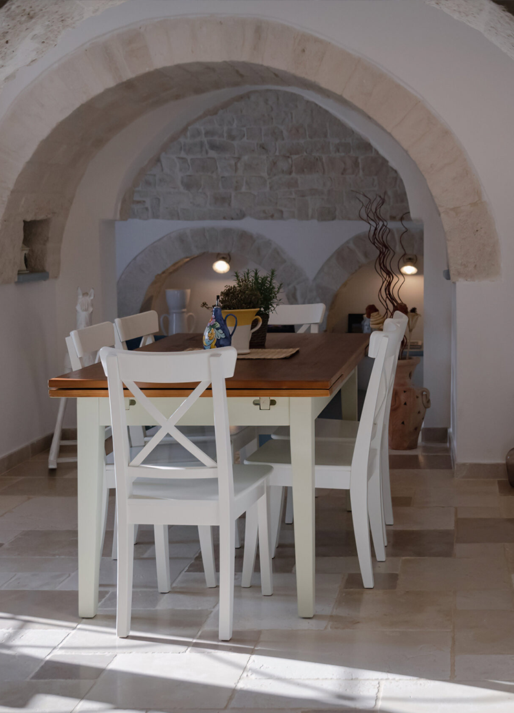 Ogni ambiente è un piccolo mondo a sé, incastonato nella pietra e circondato dal silenzio della campagna pugliese.